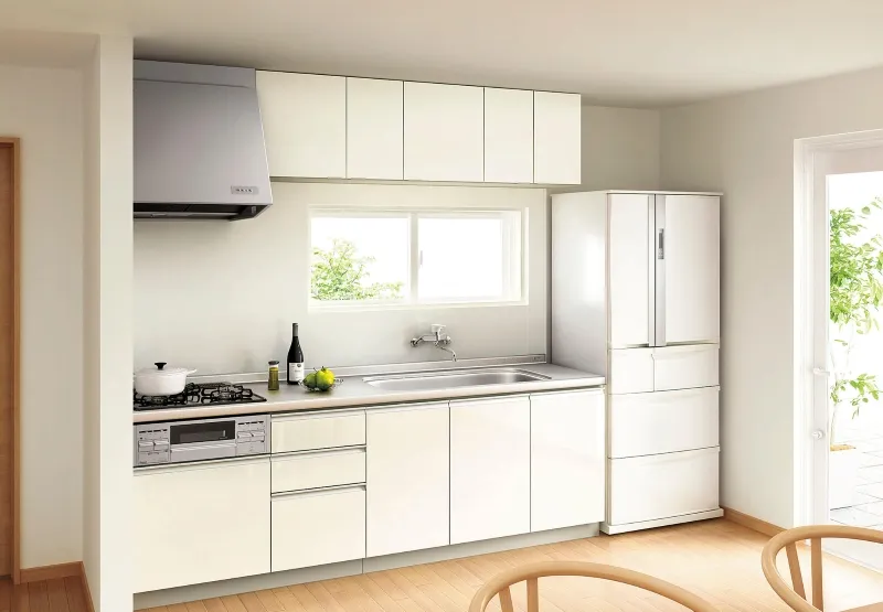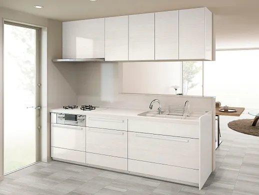基本機能を備えたエントリークラス。扉デザインはシンプルですが、近年のモデルはスライド収納(引き出し式)が標準的で、十分な使い勝手を確保できます。コストを抑えて清潔感のあるキッチンにしたい方に最適です。