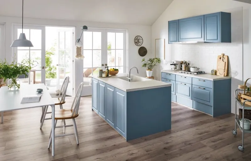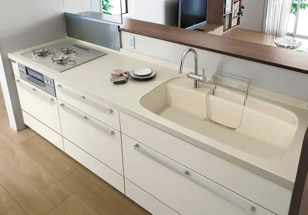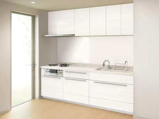 基本のL字構成を低コストで実現するクラス。扉や天板はシンプルですが、最近のモデルは汚れが落ちやすい表面加工が施されており、コストを抑えつつ広々とした作業場を確保したい方に適しています。