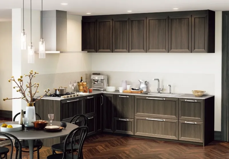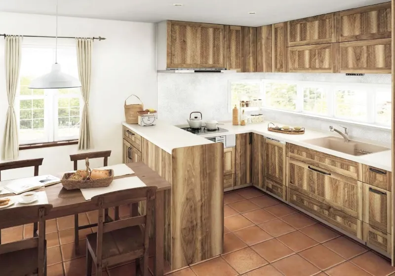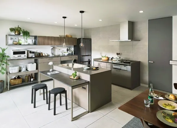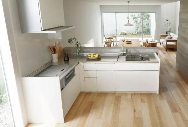 機能性と使い勝手のバランスが良い一番人気の層。 デッドスペースになりがちなコーナー用のスライド収納や、汚れが溜まりにくいシンクなど、L型特有の弱点をカバーする便利なオプションが充実します。