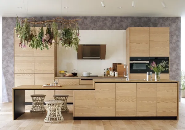 対面の良さを持ちつつ、レンジフードを壁側に寄せて設置できるため、視覚的な圧迫感を抑えられます。