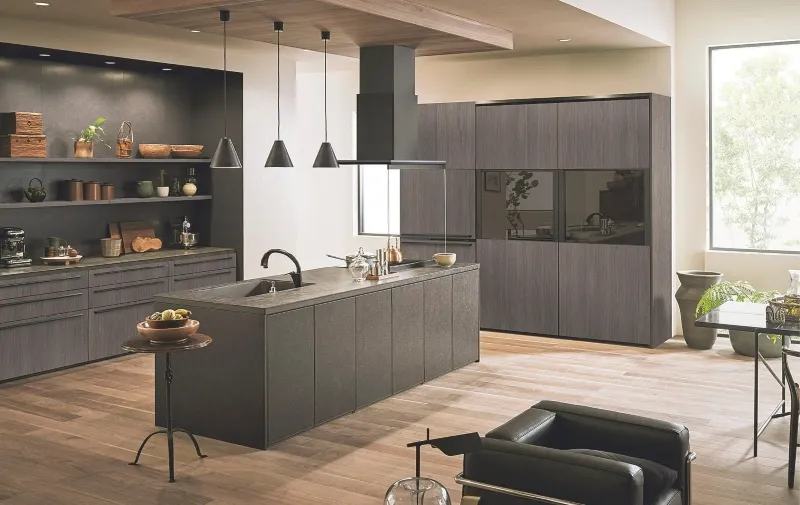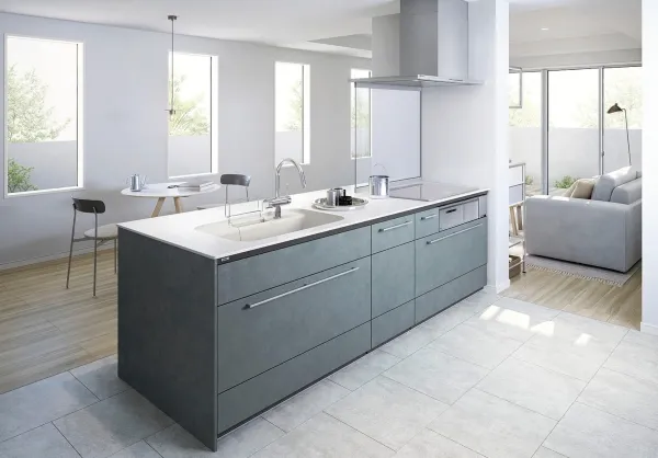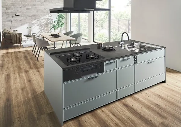 重厚感のある天然石調の天板や、耐久性の高いステンレスキャビネット、自動洗浄レンジフードなどを備えた最高級モデル。広い天板を活かした贅沢なインテリア空間を作り上げることができます。