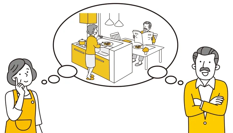 「コンロは壁、シンクは対面」と役割を分け、効率的に家事をこなしたい共働き世帯におすすめです。